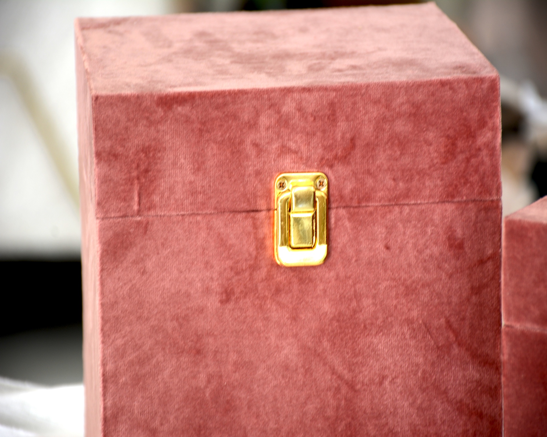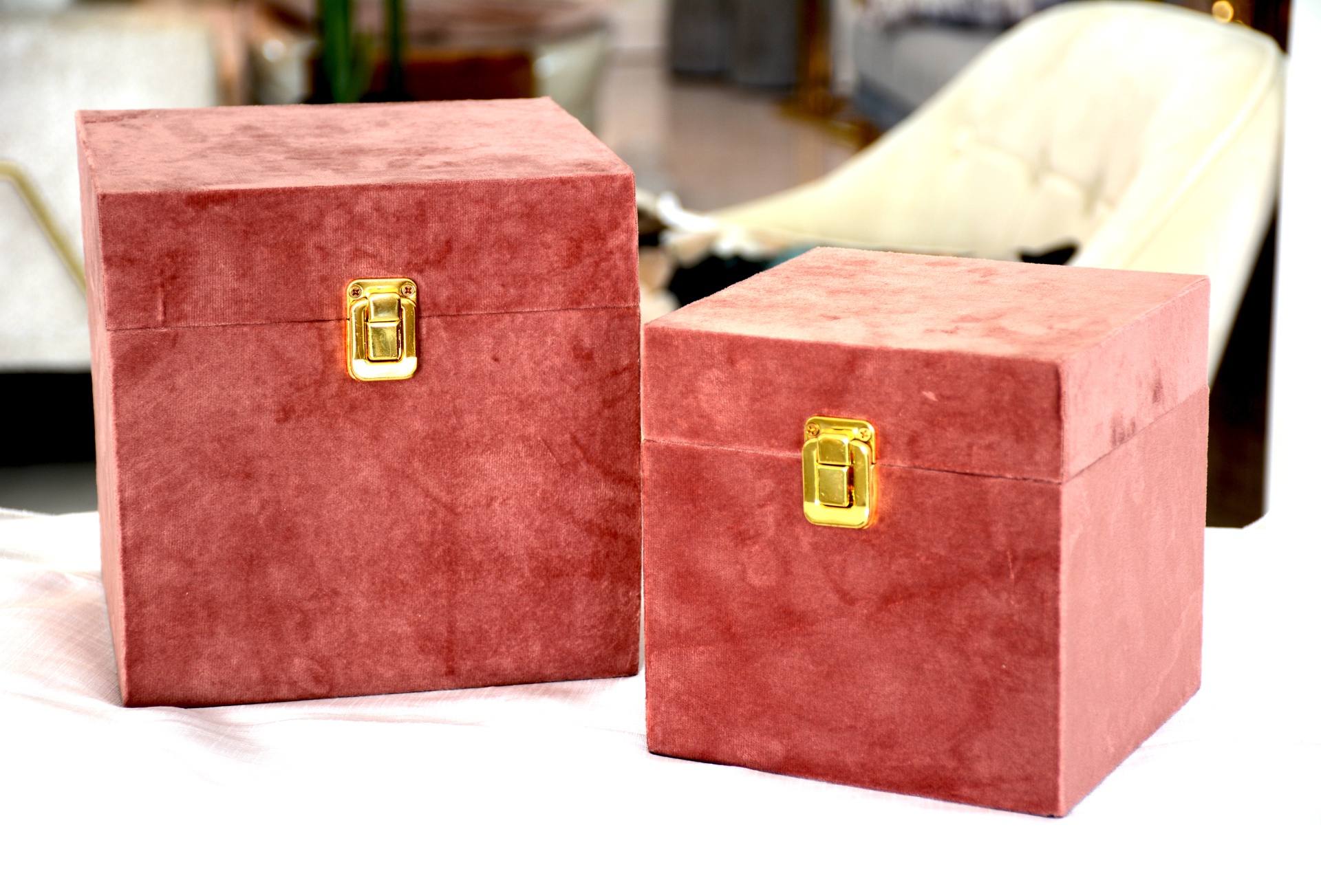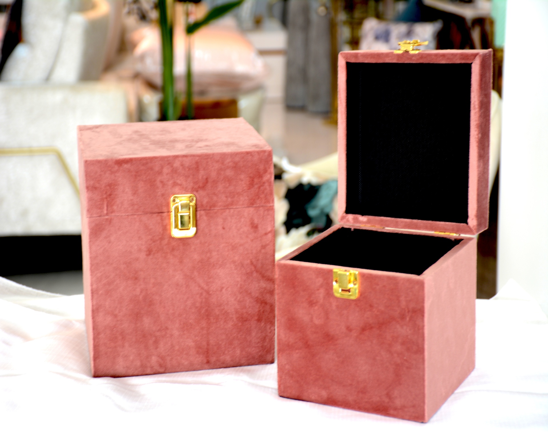 Conjunto de Guarda-Jóias fabricados em Madeira e Veludo Rosa com Detalhe em Inox Dourado.