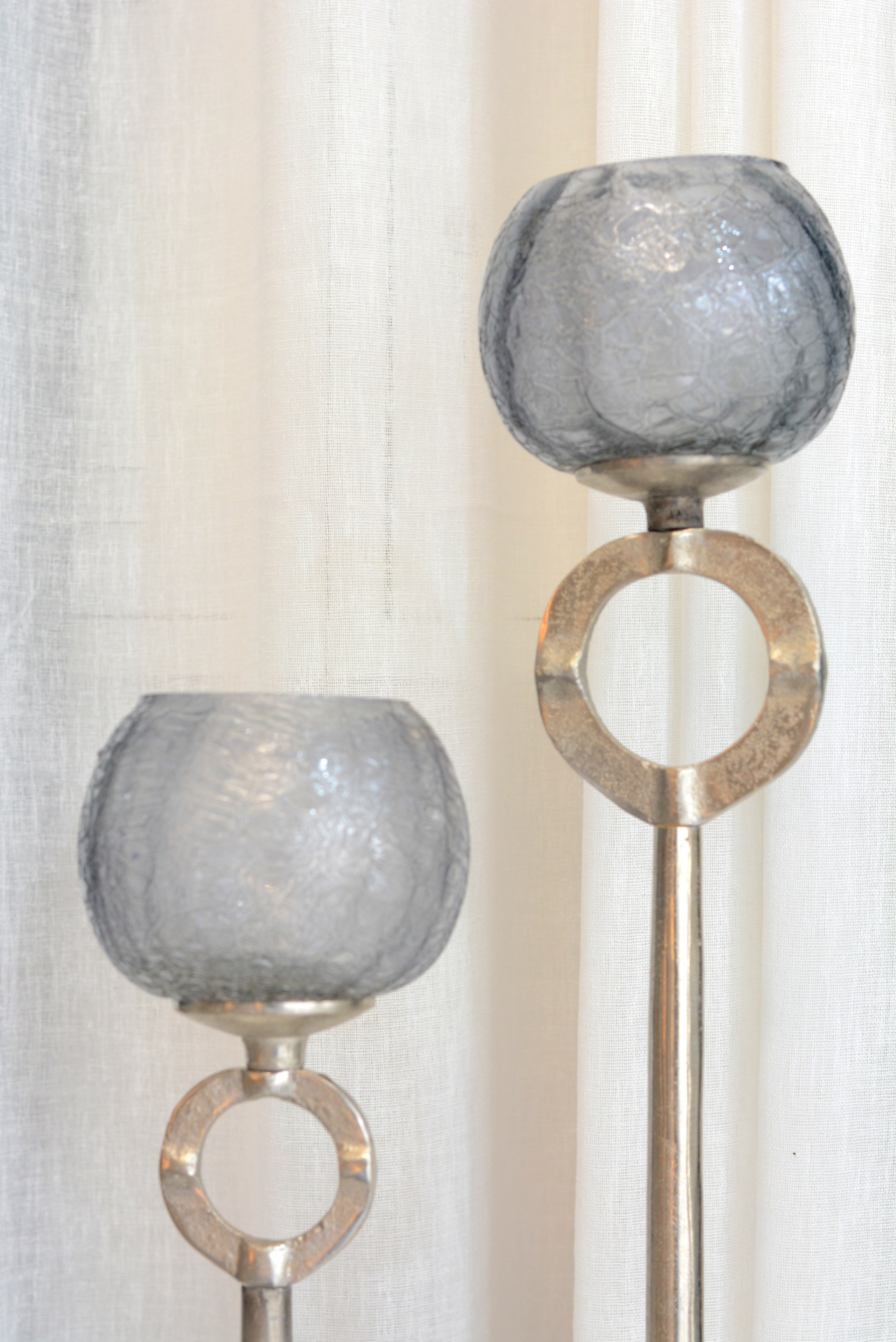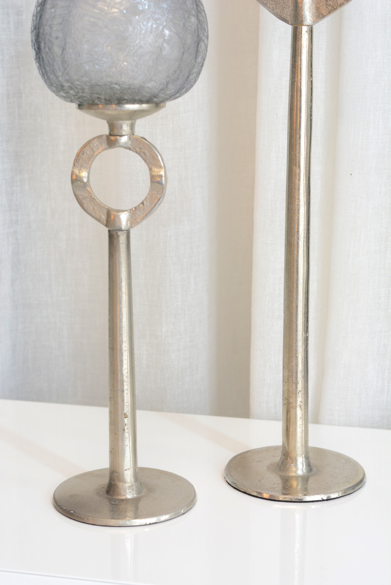 Conjunto de Castiçais fabricados em Metal e Vidro nos tons Prateados e Azul.