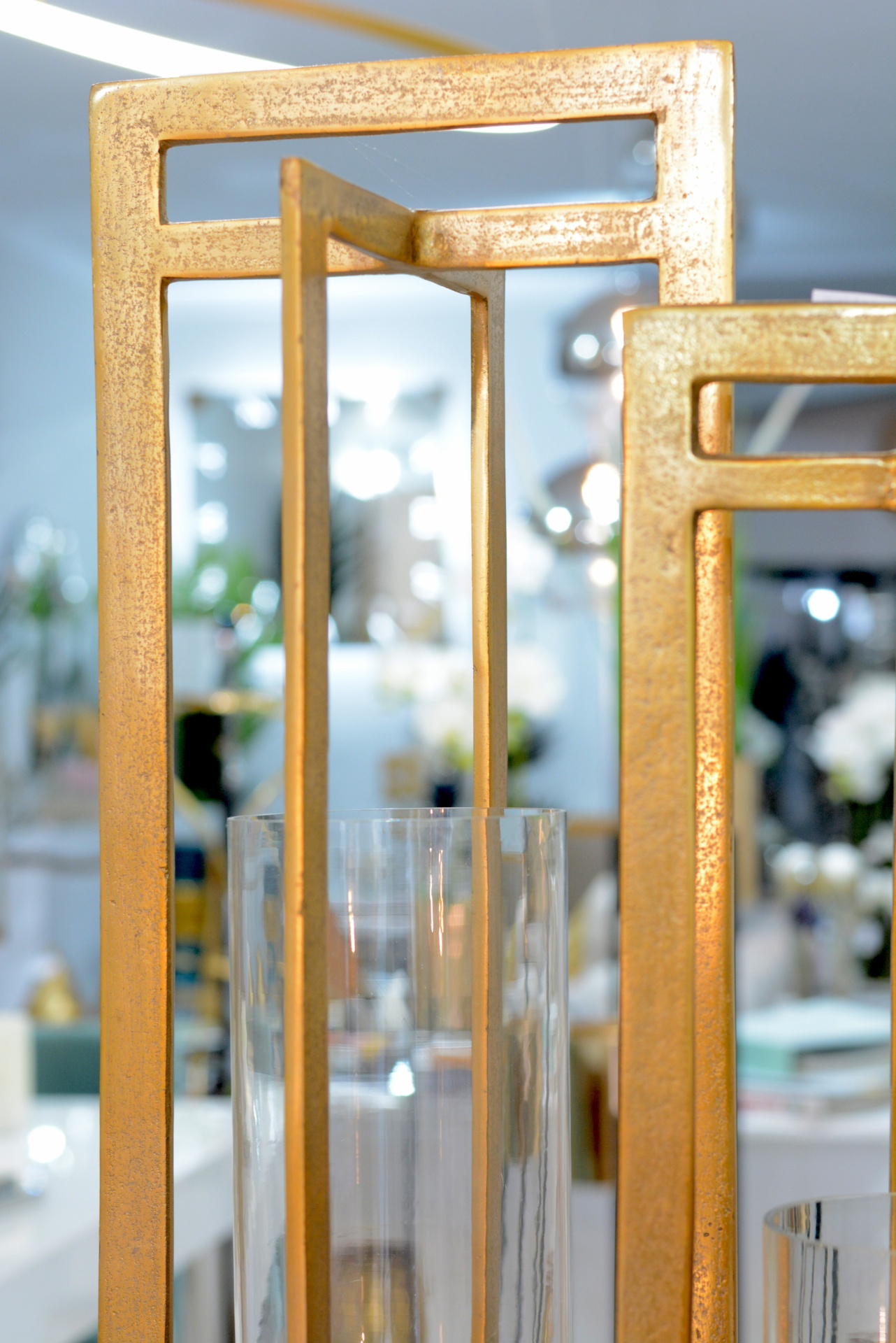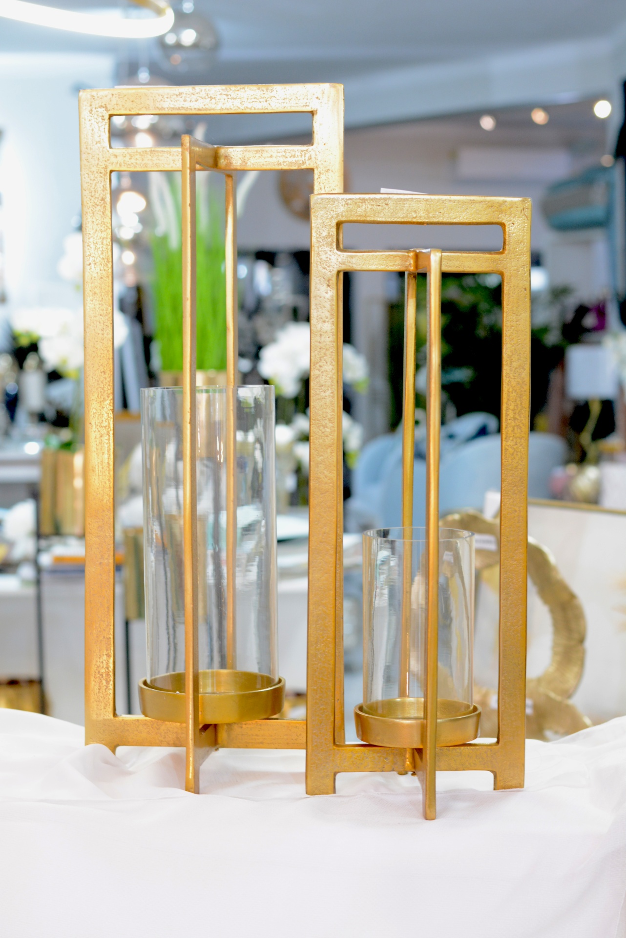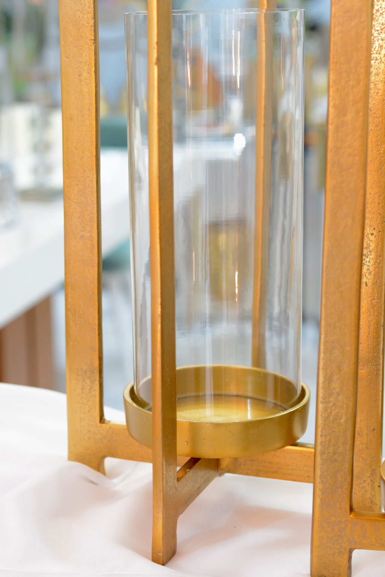 Conjunto de Castiçais fabricados em Metal nos tons Dourados com Copa em Vidro.