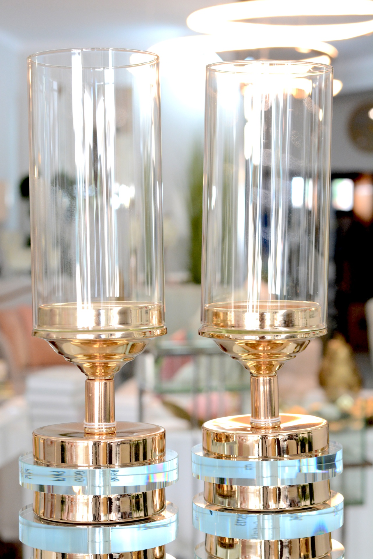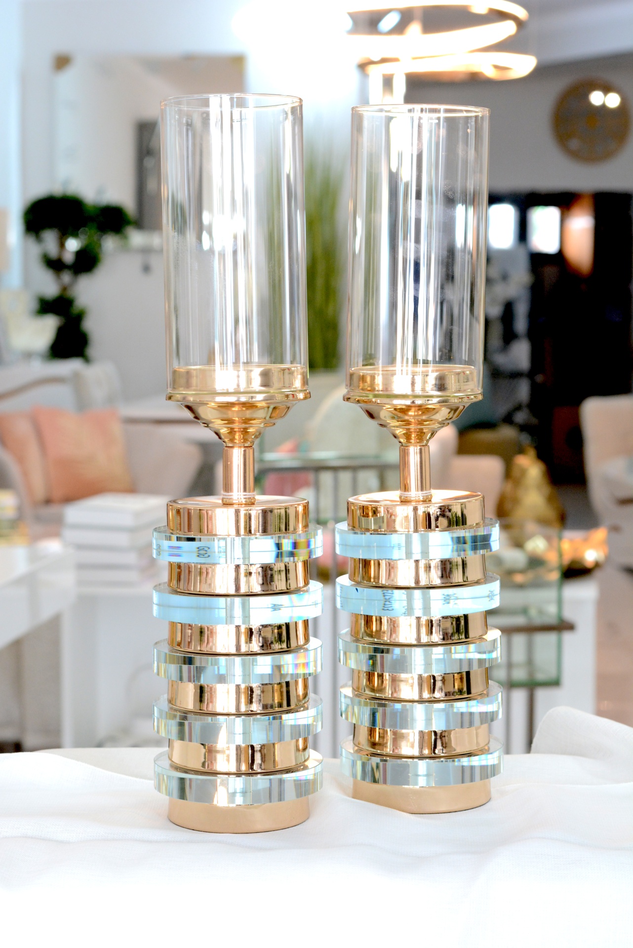 Conjunto de Castiçais fabricados em Metal e Vidro nos tons Dourados.
