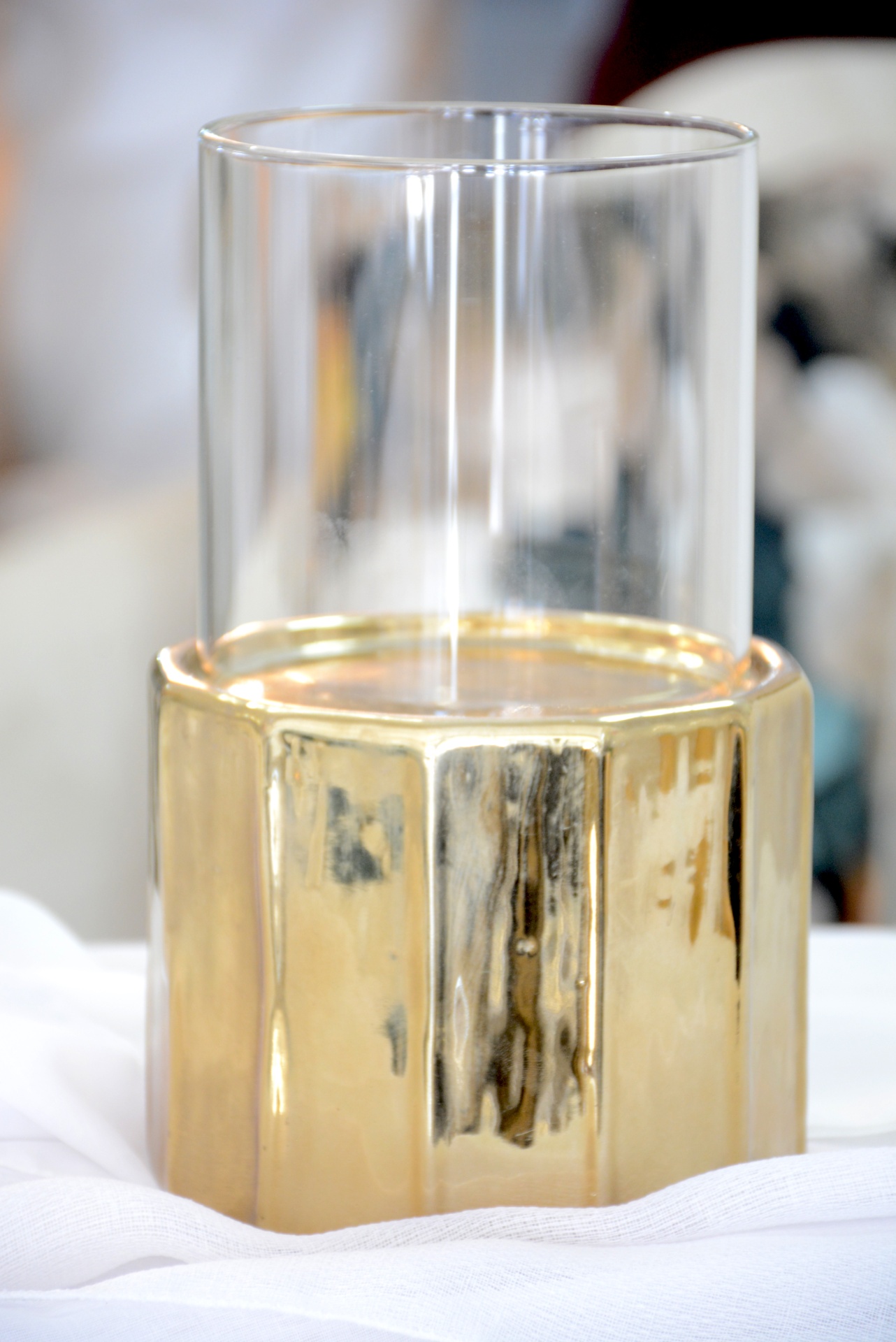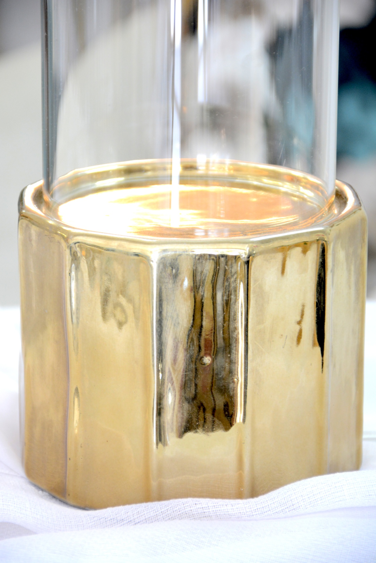 Castiçal em forma de Gaiola fabricado em Meta e Vidrol nos tons Dourados.