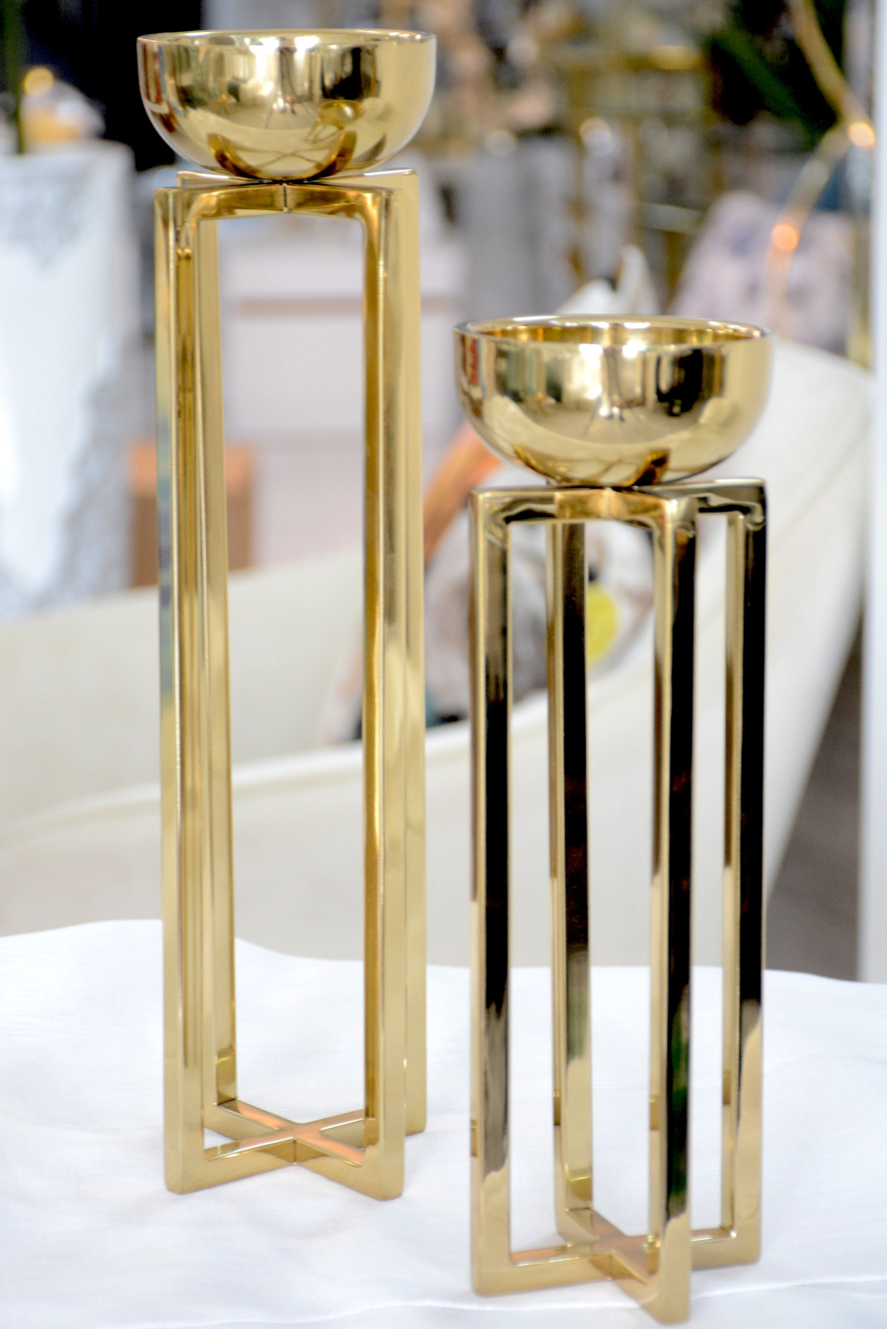 Conjunto de Castiçais fabricados em Metal nos tons Dourados.