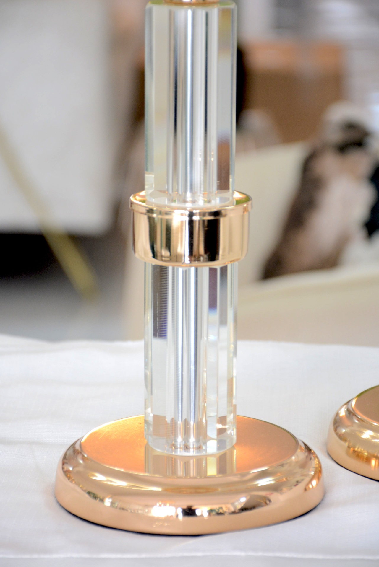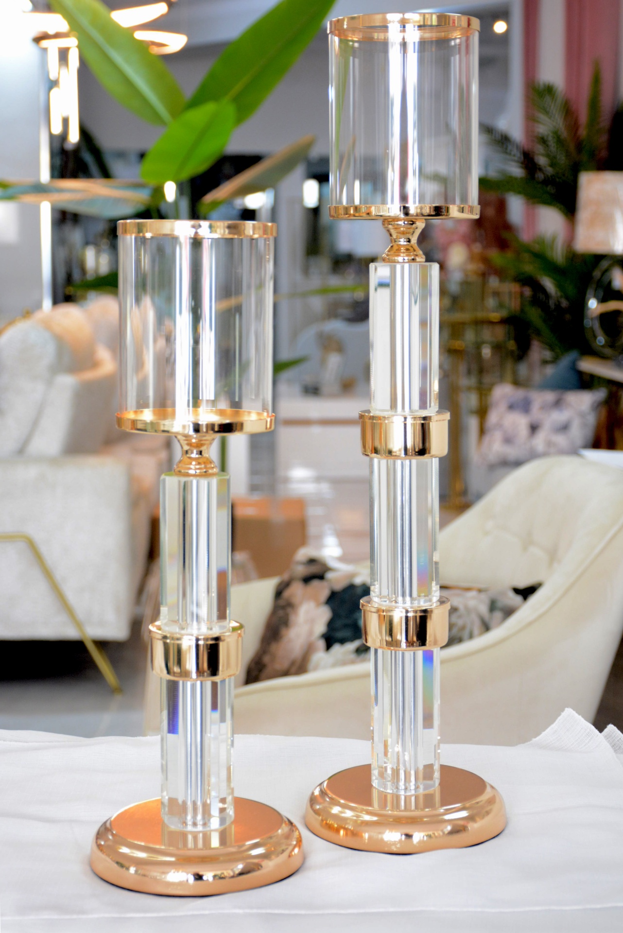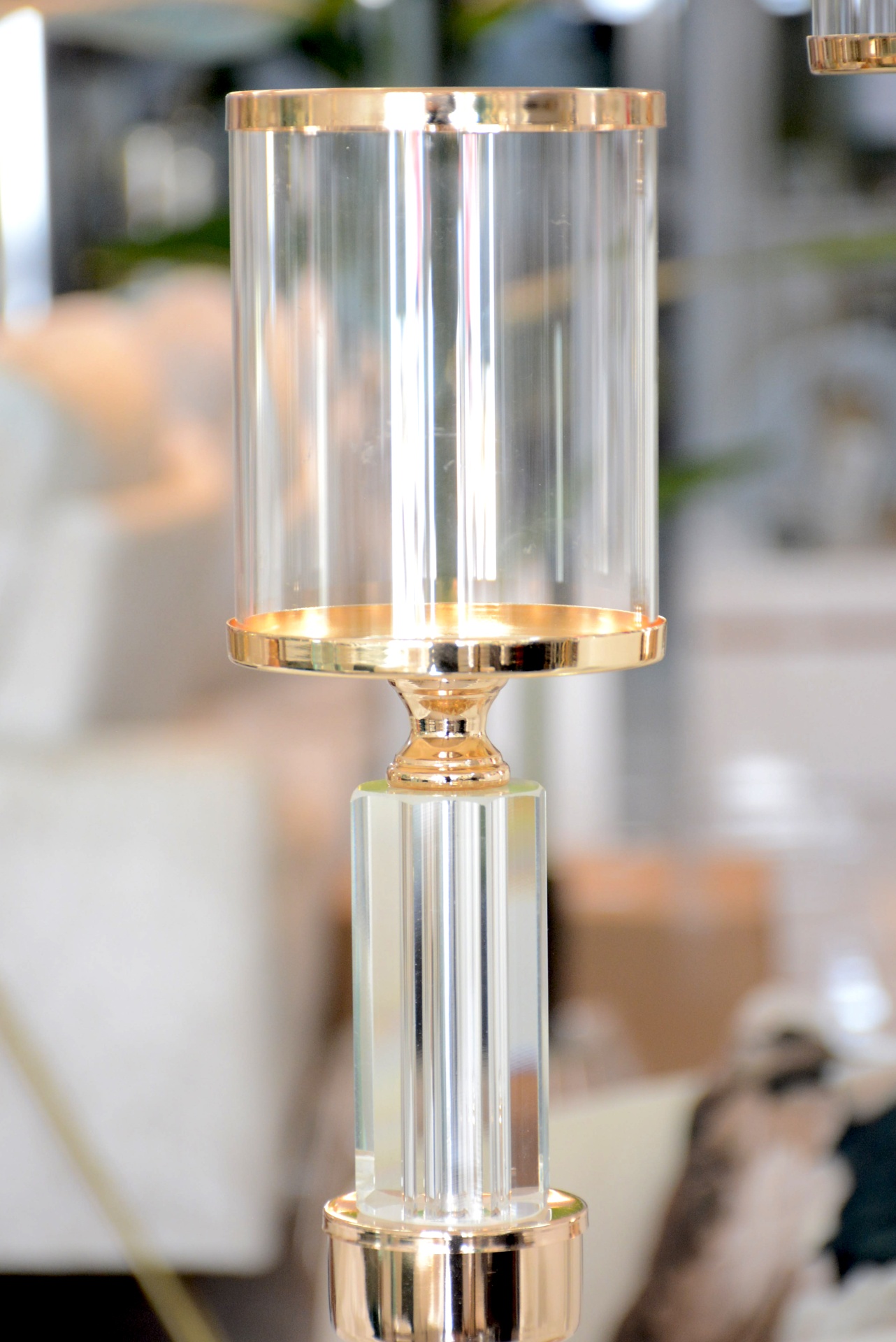 Conjunto de Castiçais fabricados em Metal e Vidro nos tons Dourados.