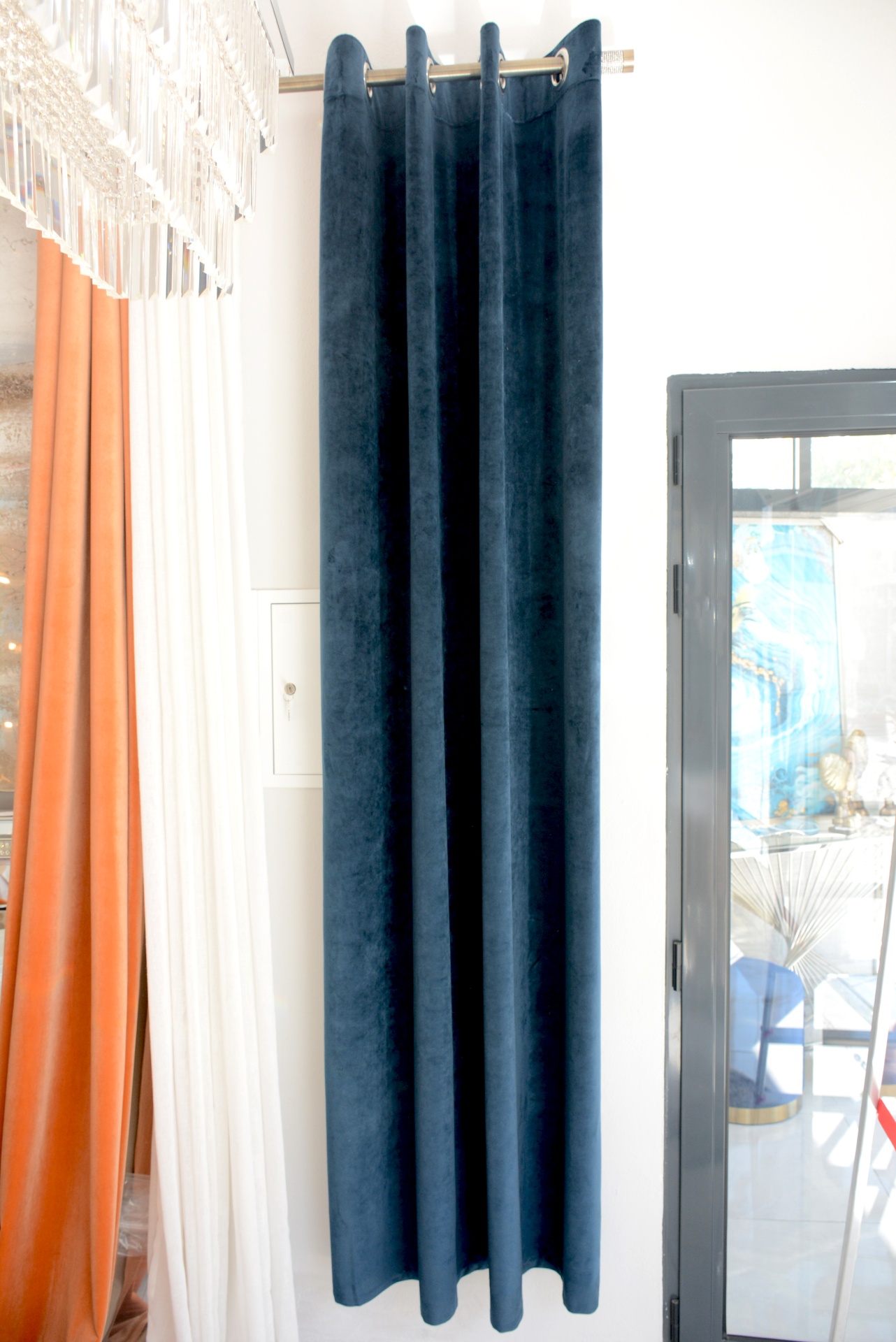 Conjunto de Cortinados Decorativos nos Tons Azuis Escuros.