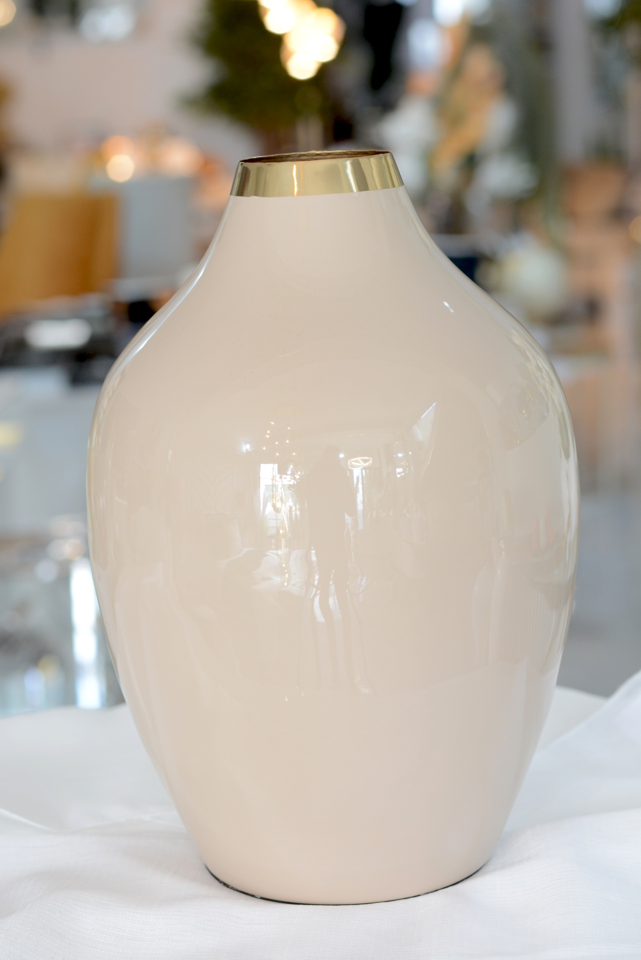 Jarra Decorativa fabricada em Metal nos Tons Beges e com Detalhe em Dourado.