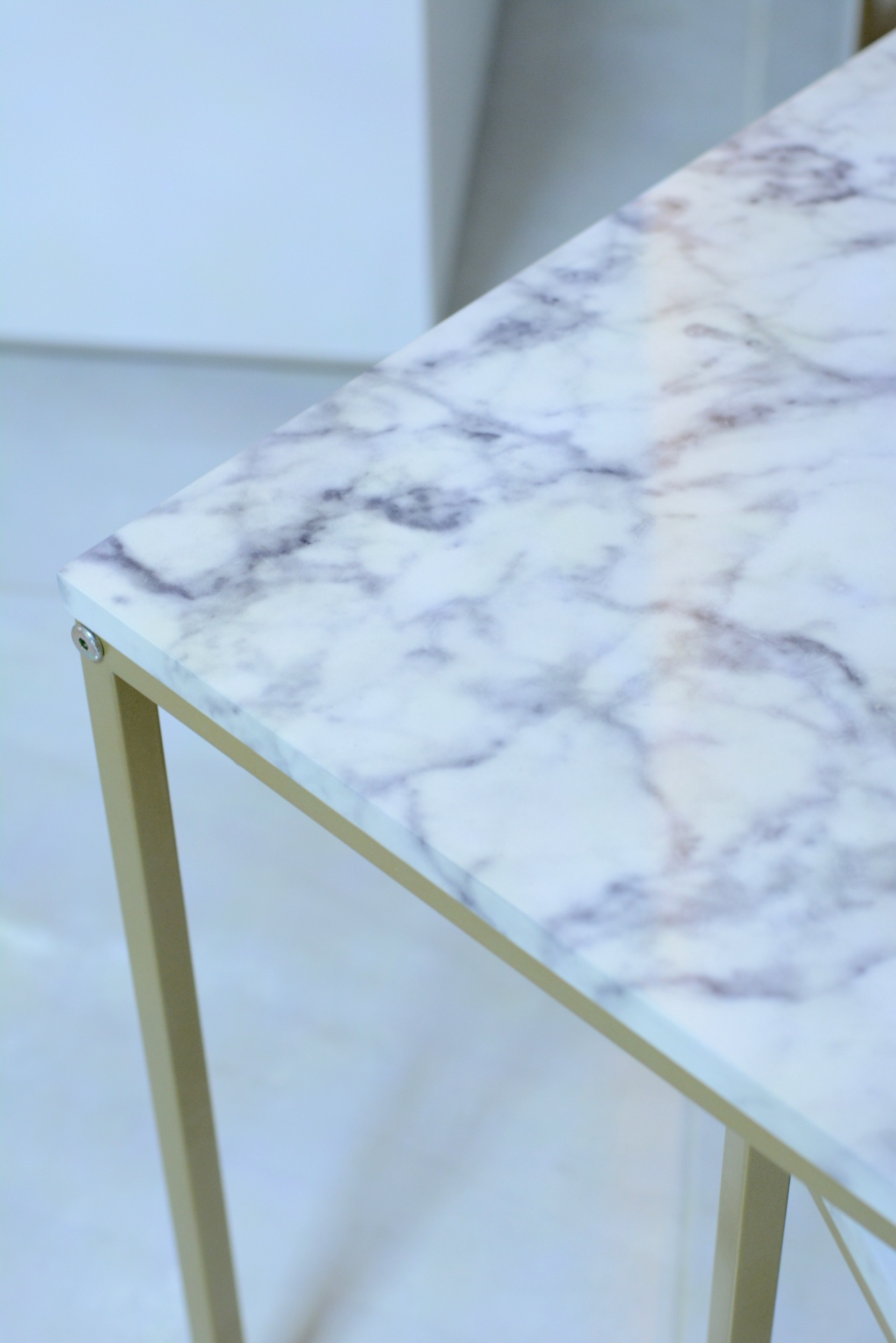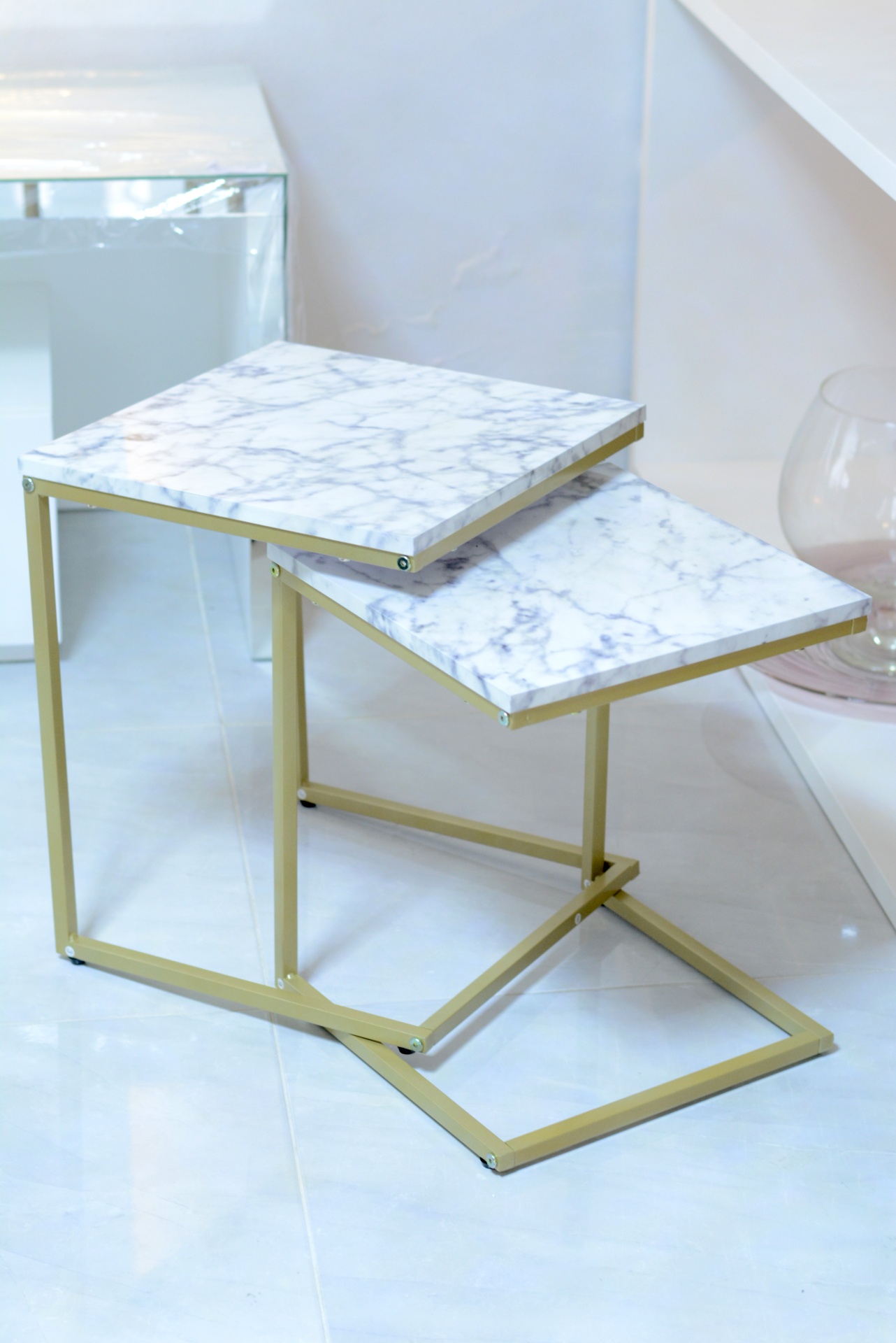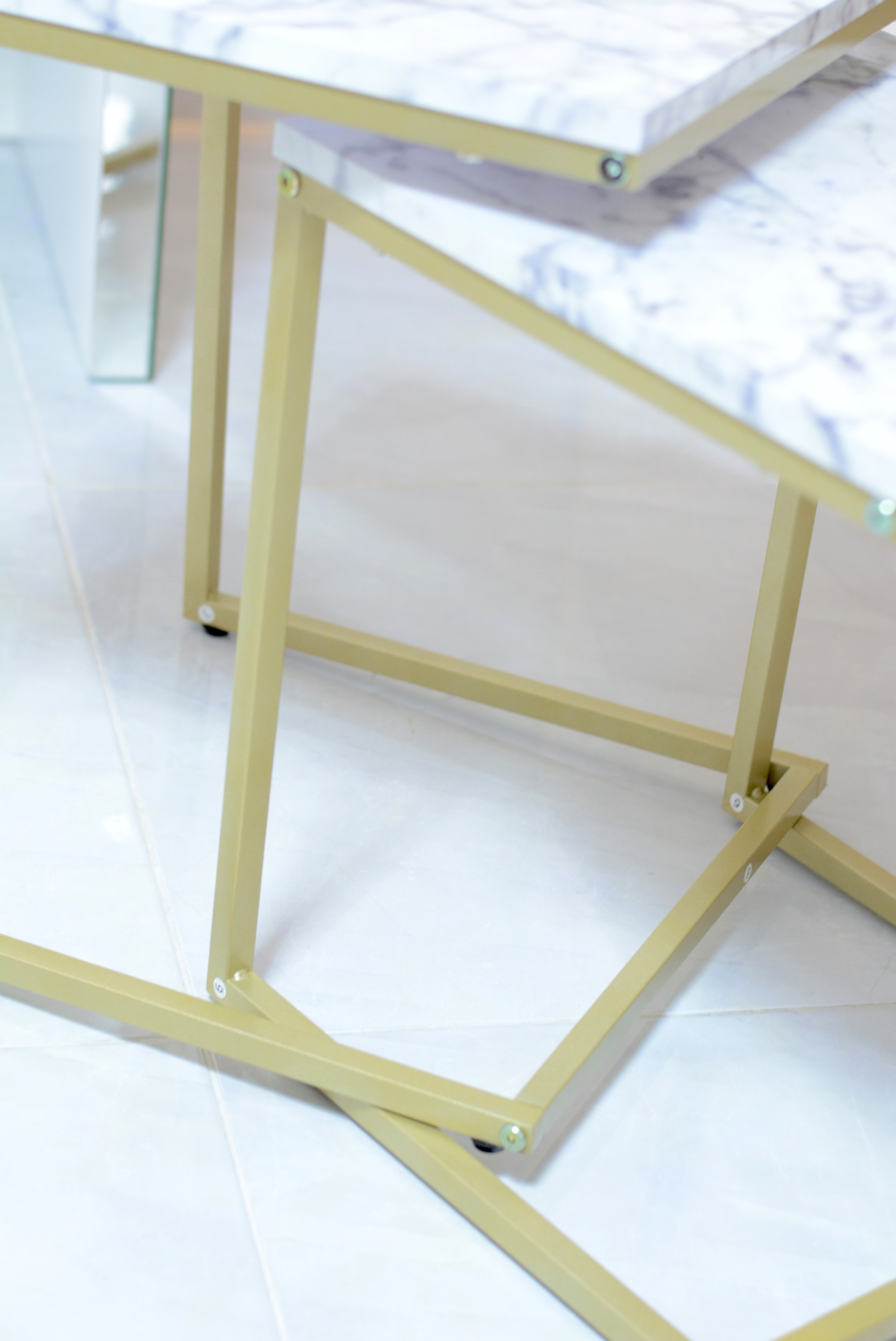 Conjunto de Mesas de Centro Douradas com Tampo em Madeira a imitar Mármore.