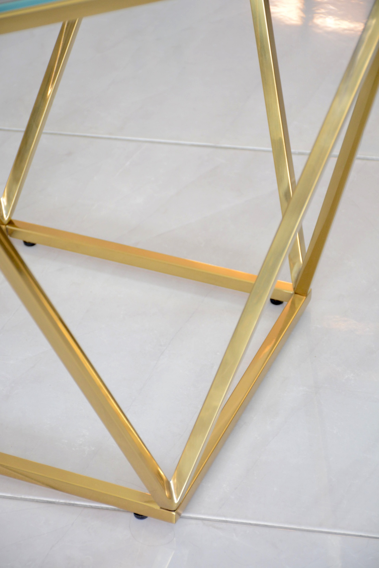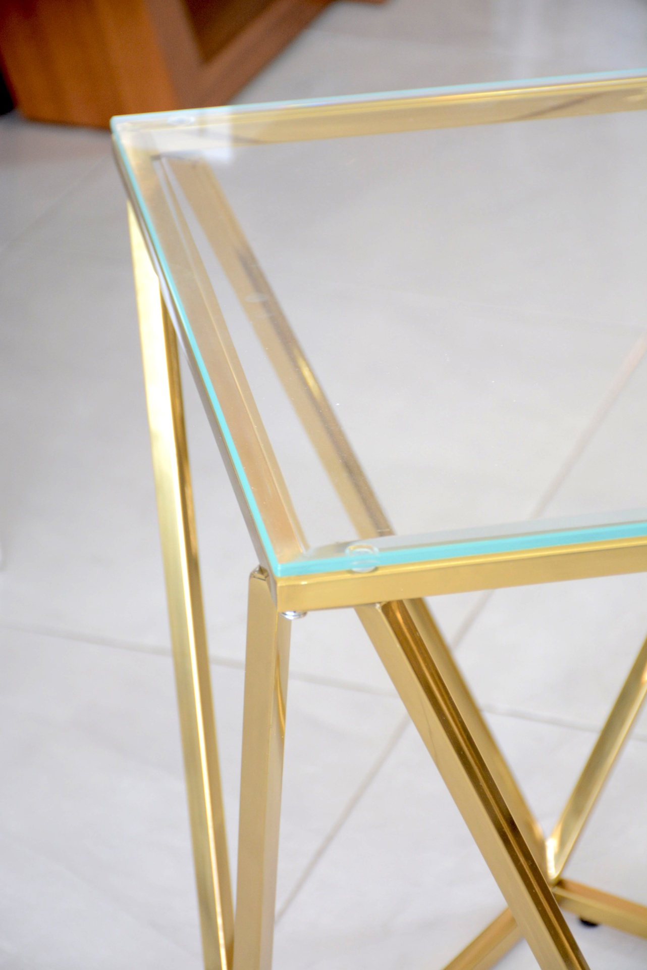 Mesa de Centro com Tampo em Vidro e Base em Metal Dourado.