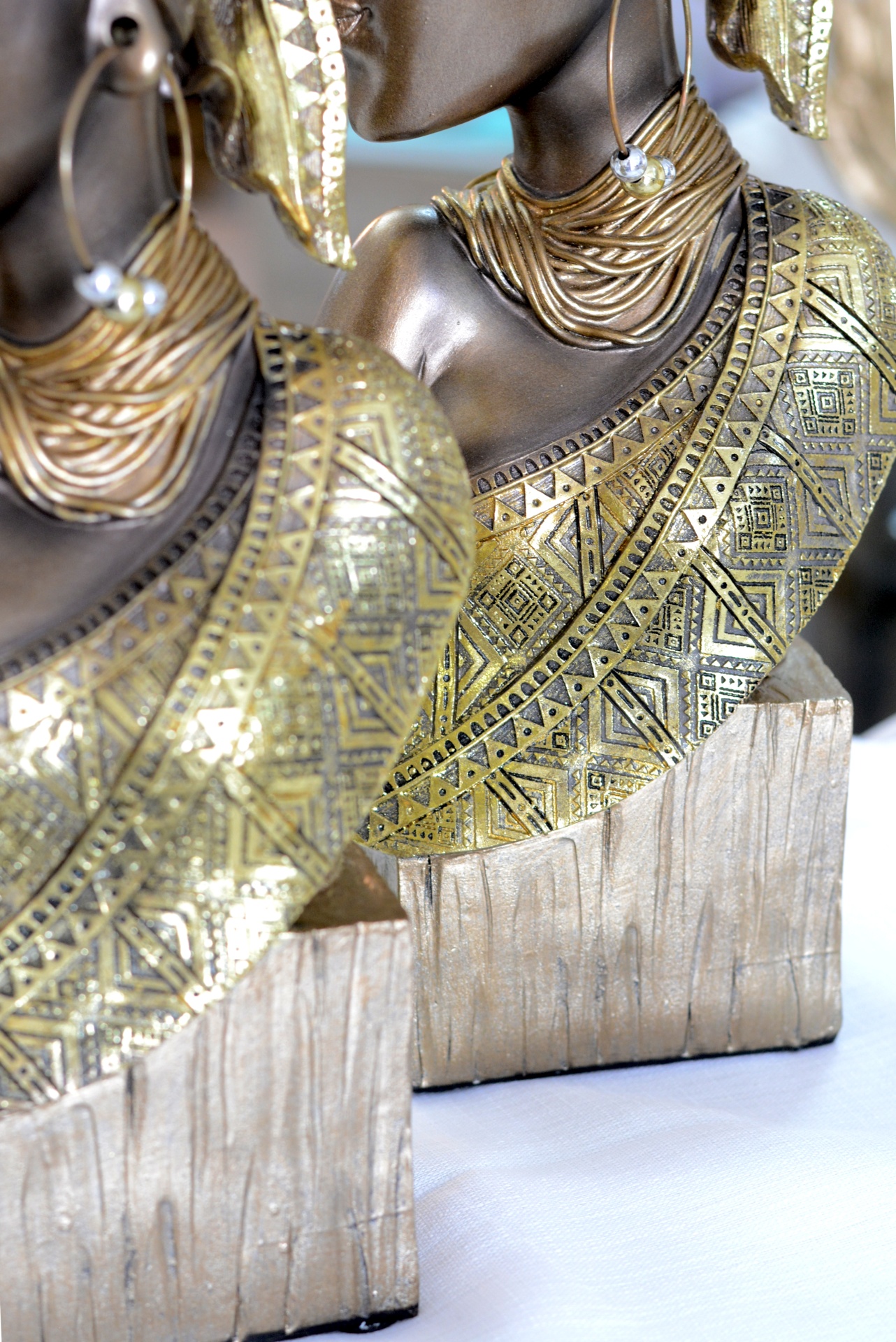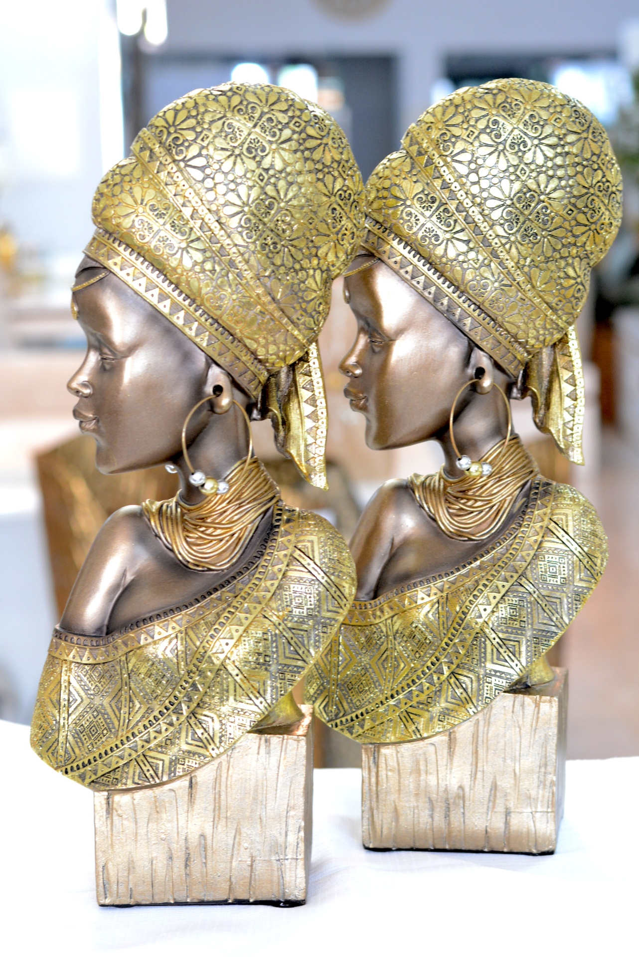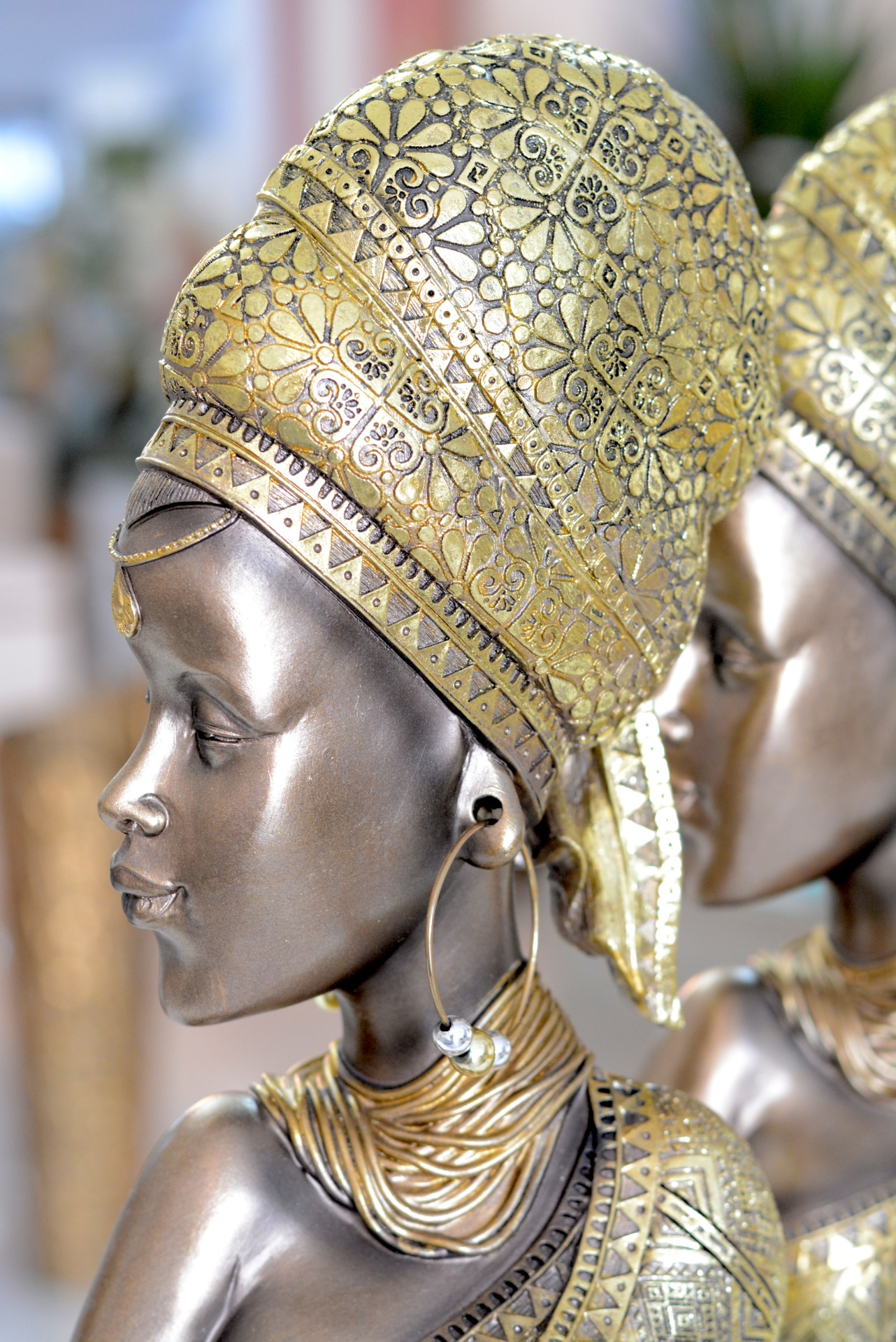 Peça Decorativa com formato de Mulher Africana nos Tons Castanhos e Dourados.