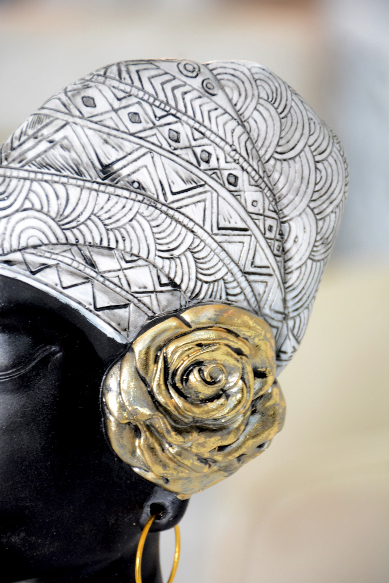 Peça Decorativa com formato de Mulher Africana nos Tons Pretos Cinzas e Dourados.