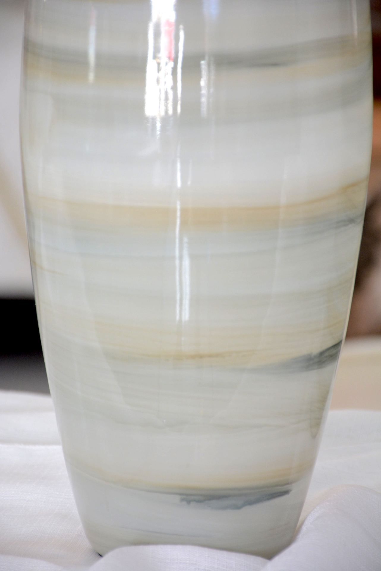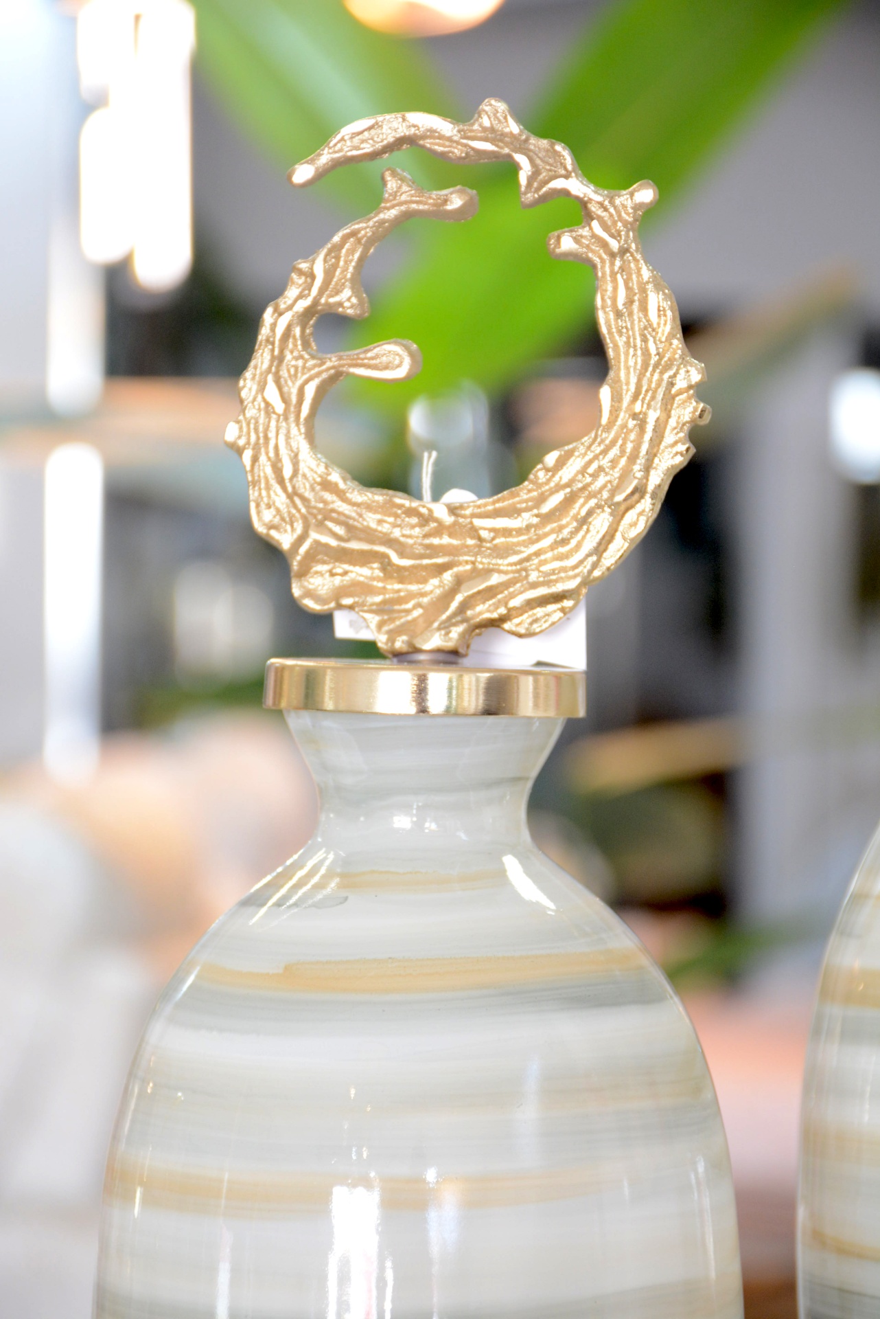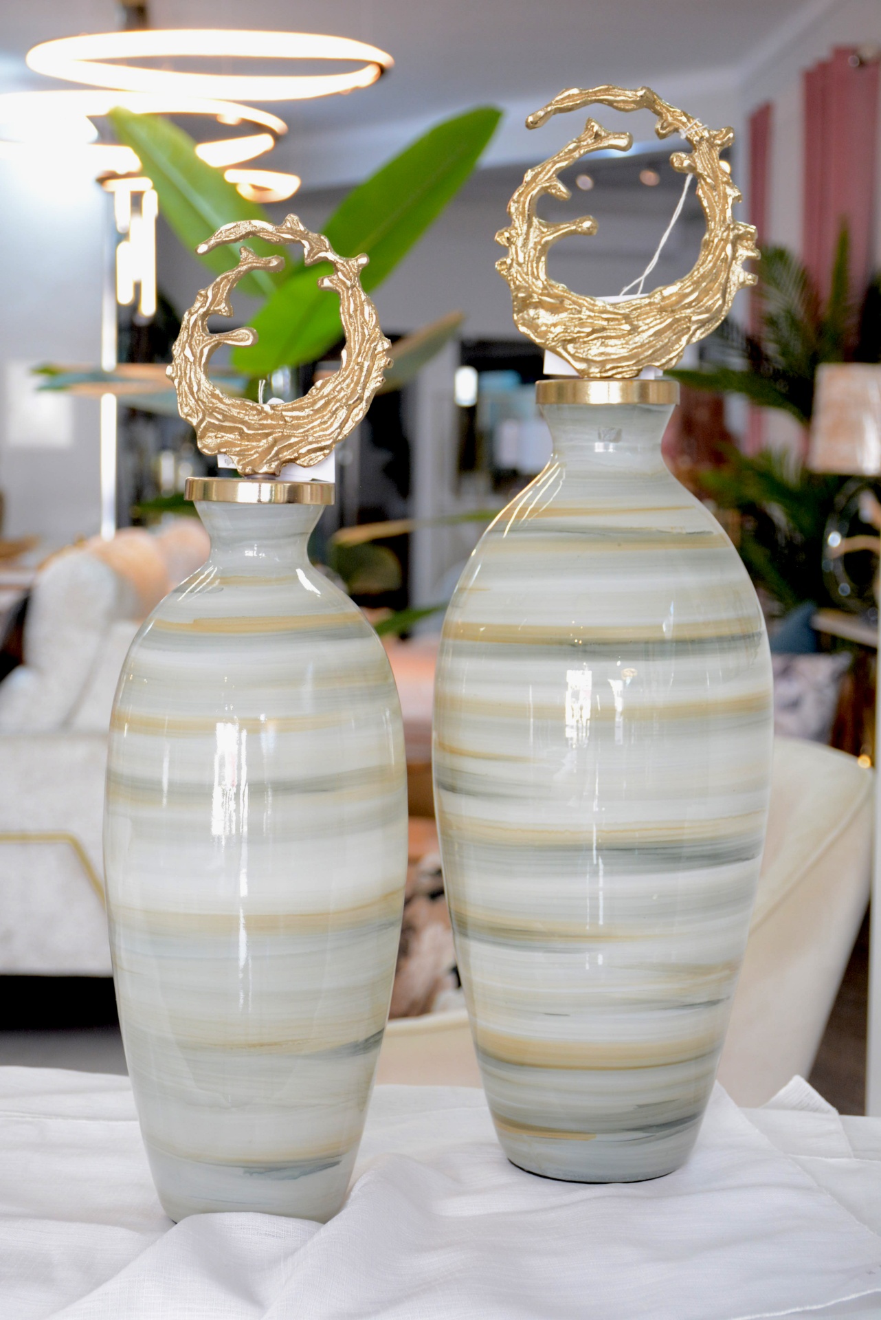 Conjunto de Potes Decorativos fabricados em Vidro com Vários Tons e tampa em Metal Dourado.
