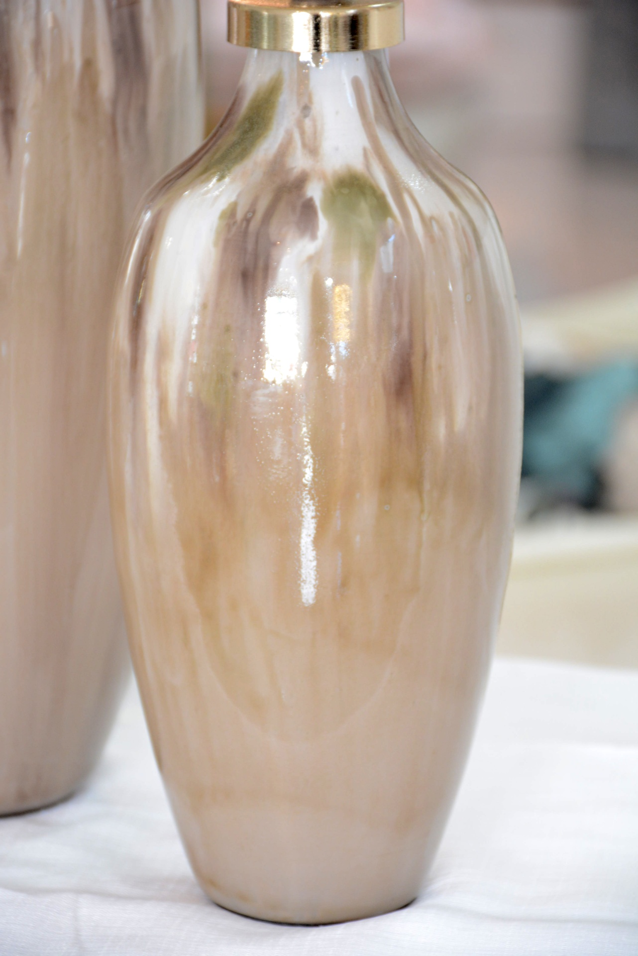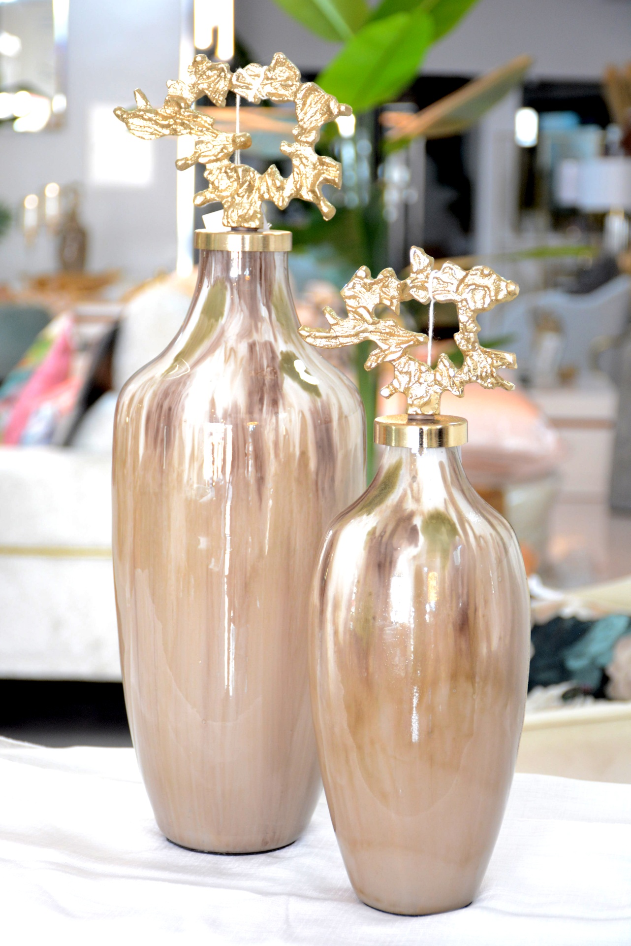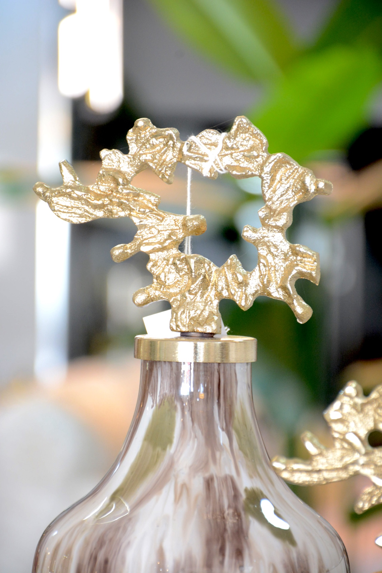 Conjunto de Potes Decorativos fabricados em Vidro com Vários Tons e tampa em Metal Dourado.